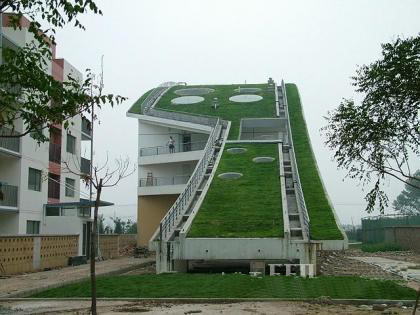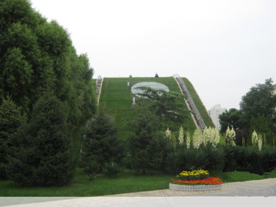 在海淀区郦城二区内,有4座被居民称作“云楼”的建筑。这4座楼房,楼高不到20米,自楼顶中部整体伸出两条如羽翼般的坡道,延伸至地面,坡道长近百米,宽度约15米,种植了茂盛的草被,形成“空中绿化带”。