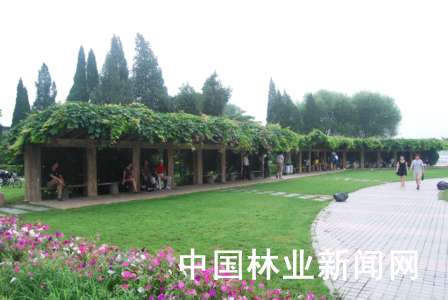 目前,在丹东市的各小区、广场,几乎随处可见各式造型不同的木制长廊上爬满攀缘植物,品种包括葡萄、南蛇藤、五味子、葛藤、地锦、五叶地锦、络瓜、藤本月季等。繁茂的攀缘植物为长廊披上美丽外装,也为前来观光、休闲游人提供休息、纳凉好去处。漫步城区,攀缘植物构造的墙面绿化随处可见。