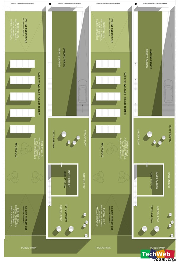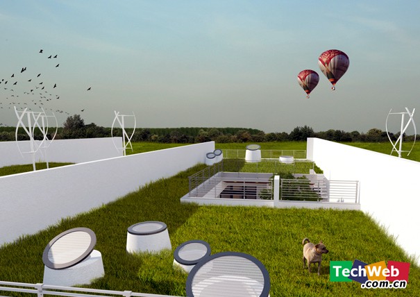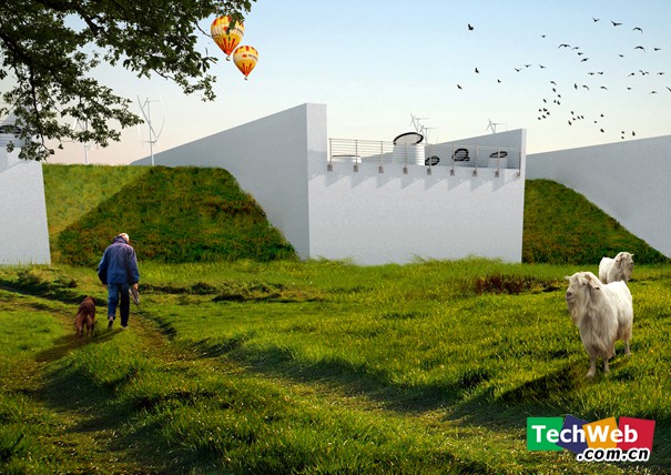 Materica Studio设计了一种新型住宅模式——把房子建在地下,这样不仅能抵御各种自然侵害,而且更加环保,保护地球的生态平衡。每栋房子大约202平,房子中间有一块家用草坪,帮助采光。房子的外墙面是斜坡状,方便行人在房顶骑行。并在房顶,外墙面加以绿化。没两栋房子共享一个“能源山”,它也由绿色覆盖,比房屋略高,主要功能是利用太阳能等自然资源转化为动能为房屋供电,地热控温在18-20℃间,帮助不过度消耗能源,控制气候。