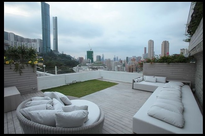 屋顶被分为两块区域。尽管这个屋顶花园在一幢低层建筑的楼顶,但它的地势足以眺望天际。