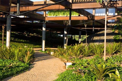 由于房屋悬空,在房屋下面种植蕨类,花卉甚至蔬菜,于是房屋就像三文治一样,为屋顶植被和屋下花园这两层绿色平面所包裹。