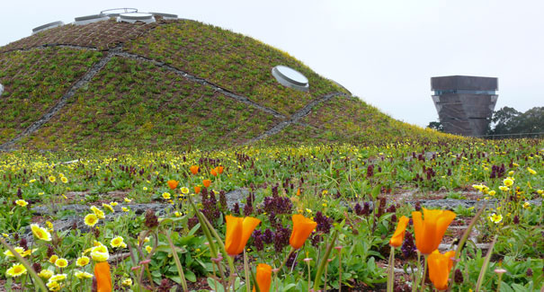 这个生态屋顶一共有197000平米,种植了40余种本地植物。它最经典的地方在于:为了防止植物和土壤从屋顶滑下来流失掉。协助Piano设计这项工程的Rana Creek设计了一种被命名为生态花盆的有机花盆,他们一共用了50000个这种带有孔的,利用可降解材料(树皮,椰子纤维)制成的花盆。由于植物的根茎能通过花盆的空洞纠缠到一起,因此,屋顶就变得和纺织物一样,土壤和植物被固定得十分结实,再也不必担心他们会滑下屋顶了。我们把城市比郊区温度高的现象称作热岛效应,而在这座屋顶花园之下,室内温度被控制在比屋顶表面温度低10度左右,不仅是降温,屋顶的植物还能将二氧化碳转化为氧气,吸收雨水,十分环保节能。开放式的设计能让游客们来到屋顶近距离感受这座屋顶花园的魅力。屋顶种植了旧金山当地的各类野花,因此也是近距离观察当地鸟类,蝴蝶等昆虫的好去处。屋顶的天窗在一天里会打开好几次,以吸收阳光给室内提供采光。屋顶还有天气监测站,能预报天气,以及时调节室内温控系统。
