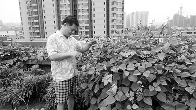 硕大碧绿的冬瓜,紫灵灵的豆角,水嫩的大葱,还有白菜、茄子等等,应有尽有。听到这些,千万别以为自己到了农家菜园子或蔬菜大棚,这是9月7日记者在石家庄市某小区楼顶看到的“空中菜园”。“空中菜园”的主人吴先生说,早有市民在楼顶种植蔬菜、水果、草坪等植物,既对屋顶进行了绿化和美化,又可为城市生活增添些田园乐趣。他已连续七年在楼顶种植蔬菜,今年又获得了丰收。