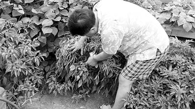 今年苦瓜和豆角收成都不错,吴先生直言“吃不过来”。吴先生还摘了一盆豆角焯熟之后晾在平台上晒干,“等到冬天的时候拿出来炖肉吃,别提有多美味了。”“现在市场上卖的蔬菜农药太多,吃着不放心,我们自家种的蔬菜只使用鸡粪等有机肥料,绝对无公害。”吴先生说,由于工作原因,他经常去郊县,总会找到养鸡场要上两袋鸡粪回来给菜园施肥。由于楼顶通风比较好,蔬菜几乎没有病虫害,生了虫子吴先生便自己动手捉拿。