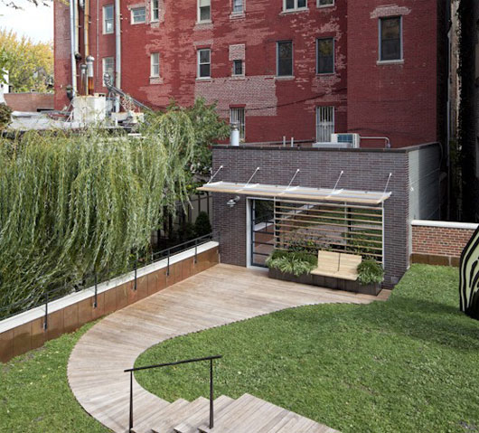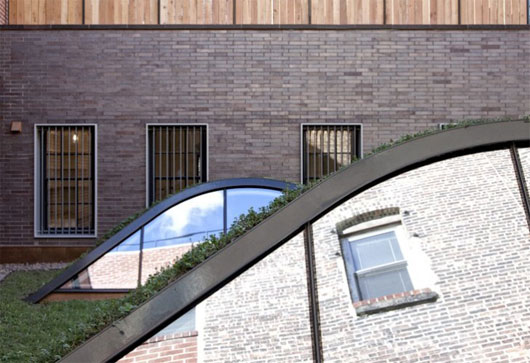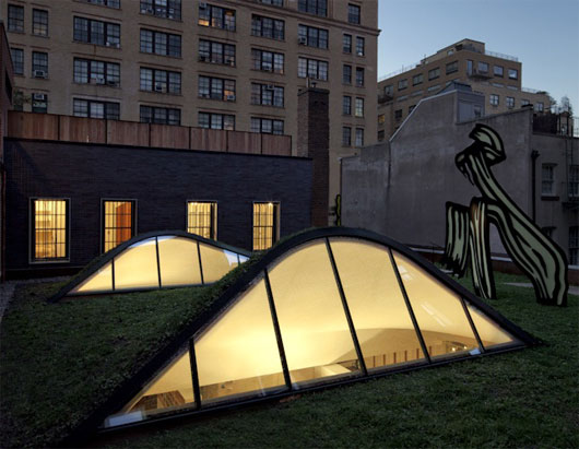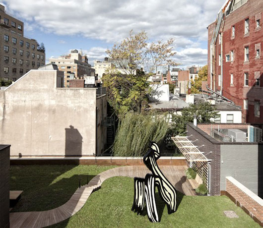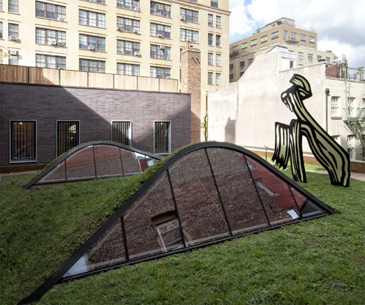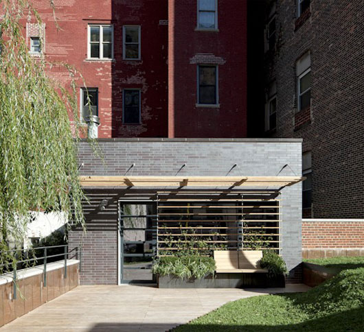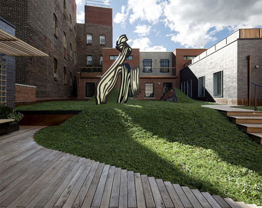 (中国建筑绿化网编译 转载须注明)近日,Caliper设计工作室成功的将纽约市中心的一群笨拙的老砖房设计成了极巨观赏价值的“楼群绿化带”。此项设计中最具亮点的当属屋顶花园中的阁楼了,阁楼的屋顶与公寓的屋顶完美的融合到了一起。这项设计的影响不仅仅在于其自然的融合了两个独立部分的屋顶,更在于它为寸金寸土的都市提供了宝贵的绿地以及缓解了热岛效应,在炎热的夏日,为这片区域带来了凉爽。