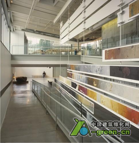 这个博物馆陈列着美国最大的化石藏品。它位于芬格湖地区,场地的自然地形启发设计师最大限度地利用它,这个现存的40英寸斜坡是两万年前冰层融化时留下的遗迹。设计没有将博物馆与场地明显地分离开来,相反它创造出一种新式的地貌:一种延续的分层的景观,它将建筑与生态环境融合成与当地地形统一的演变过程。