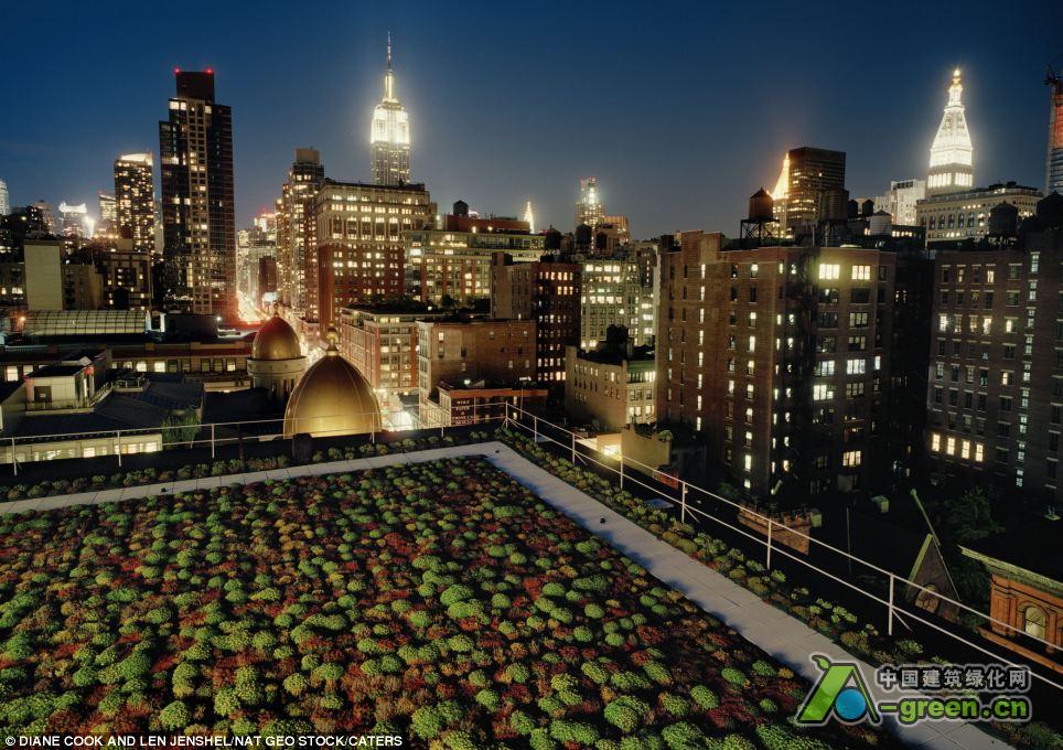 高空的风光包含从伦敦一栋房子屋顶的野花草坪到纽约一栋办公大楼屋顶的整齐的的草地。