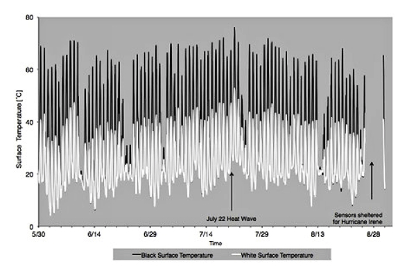 深色的屋顶、建筑、街道等由于吸收阳光,使城市更闷热,这种现象也被称为“热岛效应”,因而纽约的温度经常会比周边地区高上5度。最简单的使城市降温、降低用电量并减少碳足迹的方法,就是将屋顶变成白色,以确保他们反射热量而不是吸收。