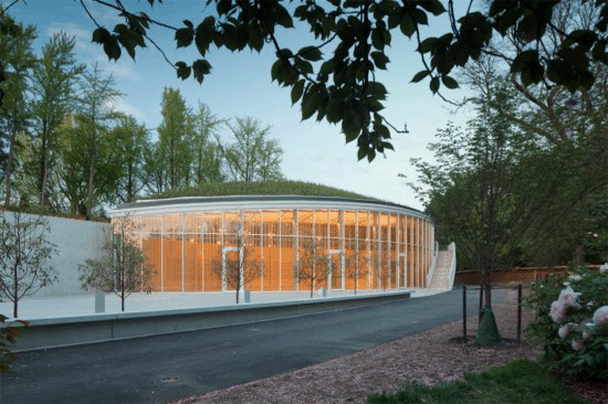 游客中心的弧形玻璃墙壁使植物园的景色变得朦胧,烧结多孔玻璃可过滤光线,防止鸟类冲撞客人。建筑北立面与南立面形成对比,建造在原有的狭道中,从而提高了热效率。北立面的天窗玻璃连同南墙的烧结多孔玻璃,可最大限度地减少热增量,并使自然光照最大化。地热交换系统为室内空间供暖和制冷,而一系列的雨水庭院收集雨水径流并过滤,改善对暴雨的治理。
