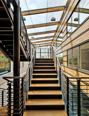 建筑的立面使用可持续性的木料搭建,由三座建筑组成。孵化器楼有着54个灵活的商业单元,中间是一个安装了EFTE顶棚的“街道”,所有的小公司都可以在“街道”上展示他们的产品;第三座建筑是一座弯曲的楼体,容纳了一个可容纳300人的讲演厅以及一座咖啡馆和会议设施等。