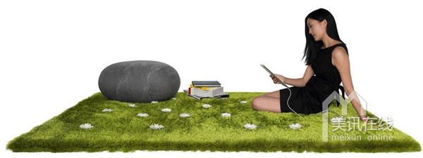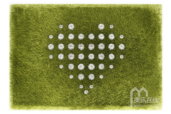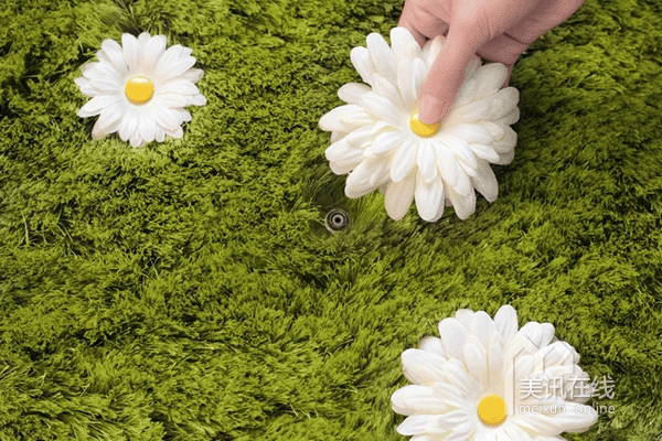 采用类似玻璃的柔软材料编织而成的地毯有着青绿色的草感绒毛,其中内藏有84个圆形接口,可以让你把雏菊“种植”上去,排列出各种图案,每天都有焕然一新的感觉。