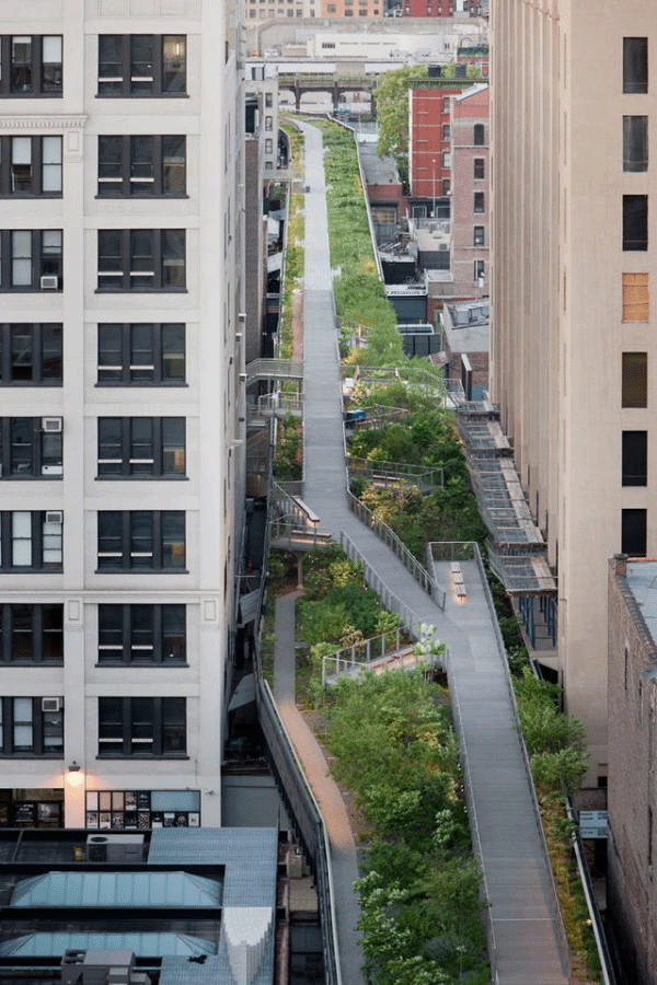 在西25大道和西26大道之间,建筑师在两座相邻建筑之间创造了一个微型森林,这里种植了茂密的灌木丛和小树。现在,设计师又在原有的环境上架起了一座高8英尺的步行道,这种处理让地面上的植物可以自由生长并且保持了原本有机起伏的地形,参观者则在茂密的树廊下穿行。