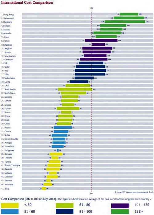 尽管2013年的经济不甚景气,但是欧洲仍然有6个最大的昂贵市场,这也体现了欧元面临巨大的挑战。世界在建筑中花费最多的地区有: