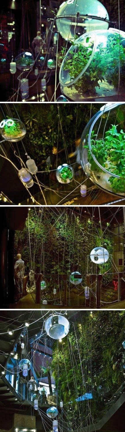 这是意大利米兰Hydro-Cobweb水电球蛛网,由很多悬浮在空中的玻璃球和交织的网络组成,每一个球中有水、植物和照明,这些设施以绿色的植物墙为背景,就像一个有生命的有机体。该装置的中心主题是生态、科技和水循环。
