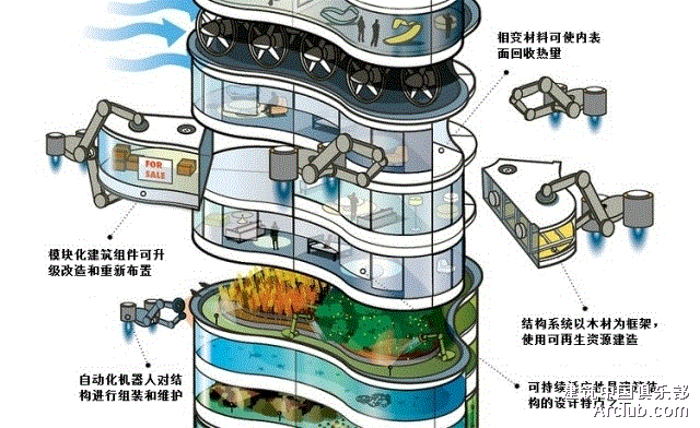 英国奥雅纳工程顾问公司(Arup)在此基础上发展出一些新兴构想,提出了这样一个未来的建筑模型。