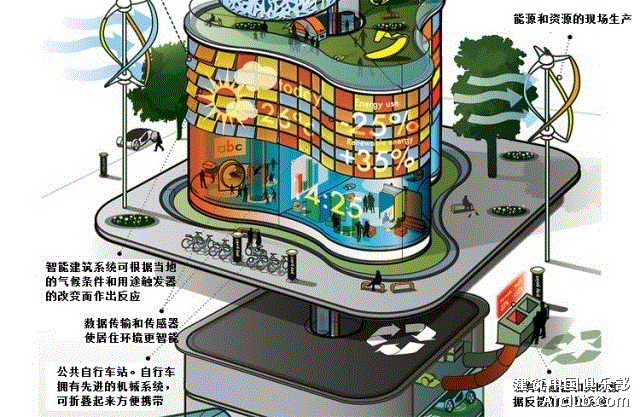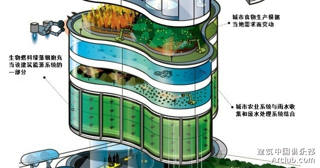 从图中可以看到,这栋未来建筑设有自己的能源系统(“微风”发电系统、太阳能光伏涂料以及用来生产生物燃料的“绿藻立面”)。