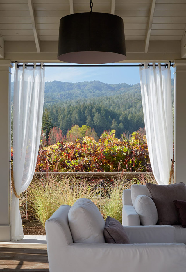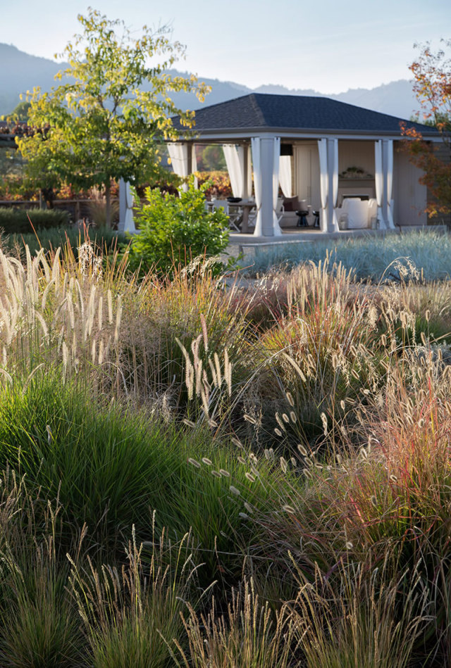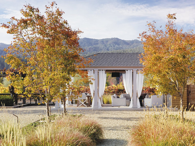 设计需要将酒乡的特点融合进花园之中。在所有方位都开发了针对邻近葡萄园的景致观赏。同样地,对更远到达山腰处的景色进行了保留以及开辟,此处的风光景色通过移除棚屋,栅栏以及亲水性树木而得到增强;也通过定位新的路径及树丛而进一步增进美感。凉亭的顶棚进行了实地调整,以使其与远处的山谷分水线相协调。