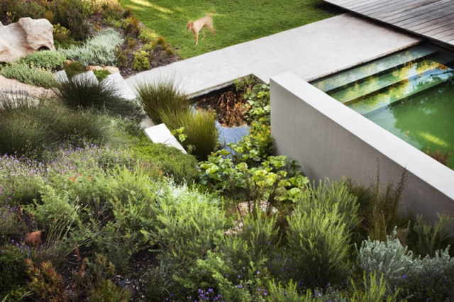 景观的核心是一个天然游泳池和一个大的木质平台,由当地巴劳木做成。泳池拥有生态平衡作用下的自我清洁,植物与砂石过滤和净化泳池的水,消除依赖有害化学物质进行清洁。 水从泳池泵到房子内院池塘,这条线路从房子的内部延伸到外部,是第一个过滤系列。 然后水从瀑布跌落,进行必要的氧气曝气,接着继续到达植物池塘,那里的植物提供了过滤的最后阶段。生态游泳池,利用生物过滤,拥有植物共生环境,不仅仅完全生态的,更能给人以像是在清澈的高山湖泊中游泳之感。