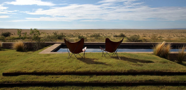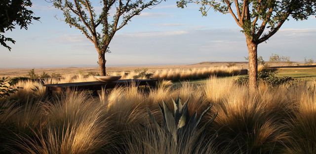 挡土墙、游泳池和野牛草草坪融为一体,展现一片开阔平整的南部风光。铁闸门、乔木、当地石材和植被,这些紧密结合的设计表现充分展现了与西德克萨斯荒凉气候环境相抵抗的风貌。