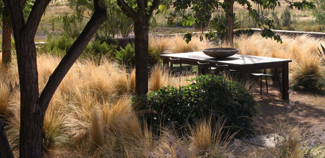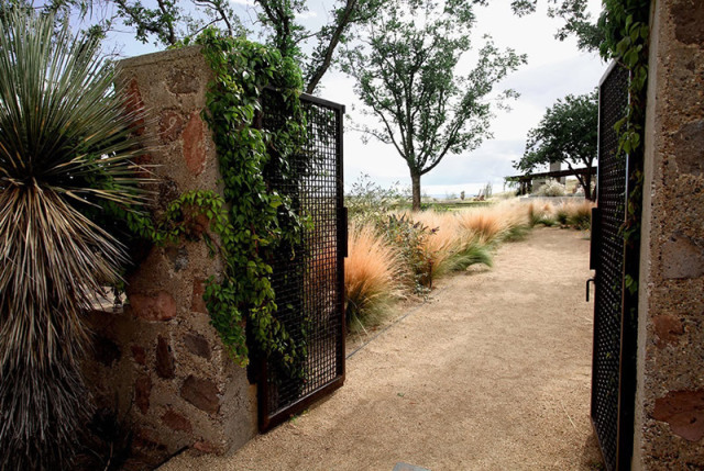 牢固的风化花岗岩走廊和铁质台阶踏板穿过铁网和大门。荒漠中的砖石建筑挡土墙隔绝了毗邻房屋在同一水平面的户外居住空间。作为对这片土地历史文化的尊重,农场先前主人种植的山胡桃和紫荆花树被保留了下来。