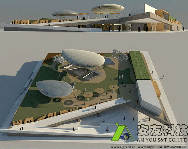 世博园区内的场馆设施,都按节能生态建筑的要求设计建设。设计上,充分利用自然风场、地下空间地道风、自动遮阳系统、自然透光、屋顶绿化、墙面绿化等,减少建筑能源消耗。