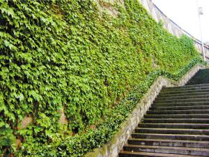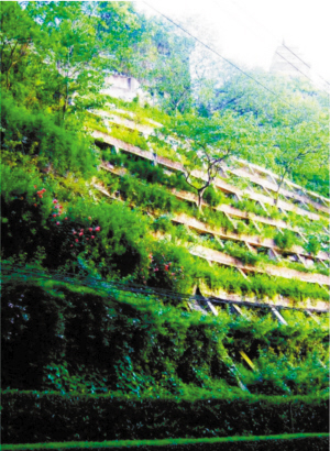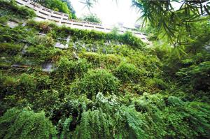 石板坡立体绿化2003年,渝中区政府为了打造石板坡绿色通廊,丰实半岛之门景观,在挡墙上实施立体绿化,建成立体绿化面积4535平方米,栽植了九重葛、美人蕉、迎春、爬山虎等藤本植物,并设置了滴灌设施。