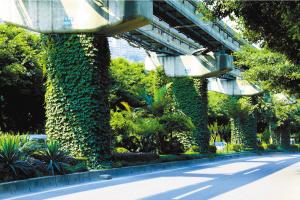 渝中区嘉滨段轻轨立体绿化占地总面积1800平方米,主要树种为爬山虎、血藤等,现桥墩立体绿化与沿线整体绿化错落交织、融为一体,呈现一道亮丽的景观。