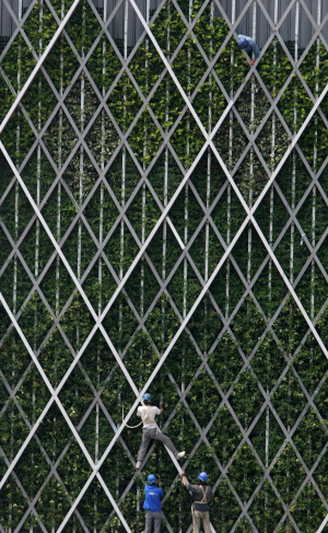 在上海世博会主题馆的东西立面上,由红叶石楠、常绿六道木、亮绿忍冬等绿色植物构成的全世界最大绿墙,总面积达5000平方米,成为一道独特的风景线。昨天,在“感知上海”系列采访中,上海世博(集团)有限公司世博项目部副总经理宋雪春透露,生态绿墙的模式吸引了不少部门、企业前来学习取经,静安区及部分企业单位就有配套建设大面积垂直绿化、复制世博会生态绿墙的想法。绿化市容部门也表示,垂直绿化在上海的推广大有前景。