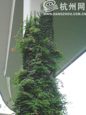 经常来往于杭州中河高架的市民也许会发现,除了熟悉的黄馨,一些绿色的藤本植物悄悄地爬上了两侧的防撞墙。高架桥桥面下也是风景独好:中河高架、复兴立交、艮秋立交下的桥墩立面上,一抹耀眼的绿色正在“慢慢”地把灰色的钢筋水泥“吞没”。