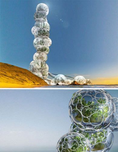 这家淡水工厂由一系列堆叠在一起的生物圈构成,从外观上看,它好像是一堆肥皂泡。这是一座怪异的高塔,其玻璃圆顶结构扮演着至关重要的角色,能够利用红树过滤海水以获取淡水。红树可吸收咸水中的物质并渗出淡水。宝贵的淡水钻出红树体外后蒸发并凝结成露水,工厂内的淡水池则负责收集露水。
