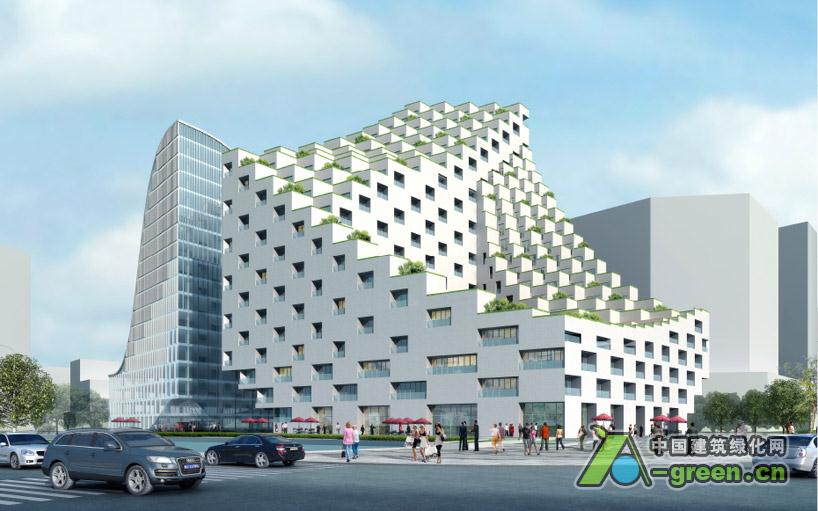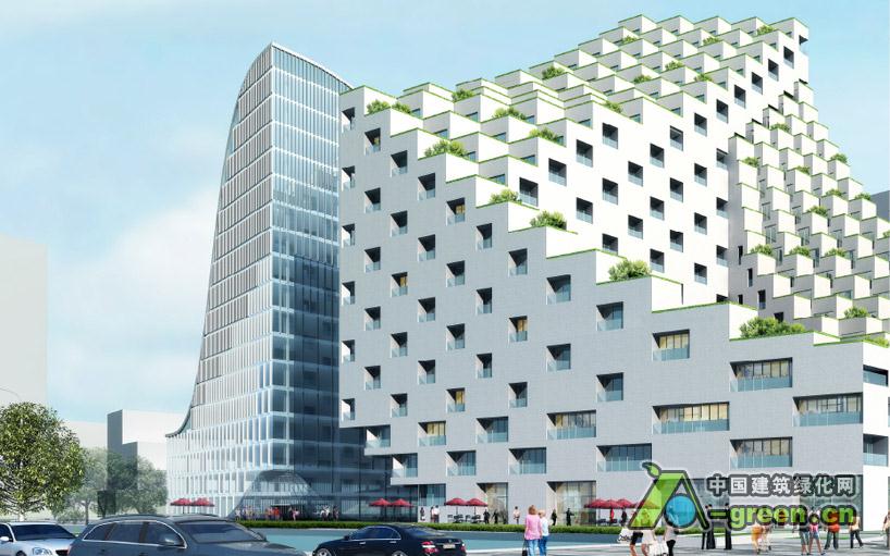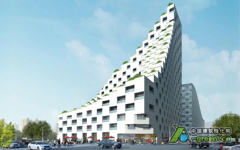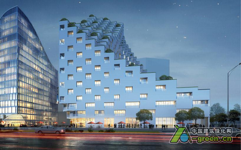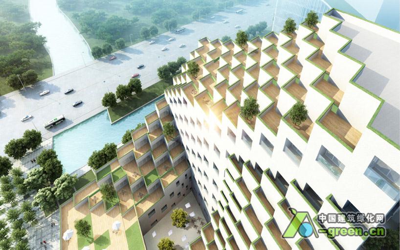 酒店由小立方体组成,外观是一系列梯田,梯田从每个房间延伸,给植被提供表皮,用来产生屋顶绿化的效果。在向下倾斜的侧面能看到相邻的公园和运河的景色。