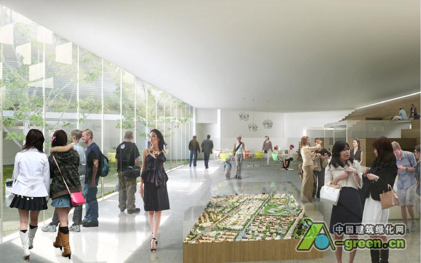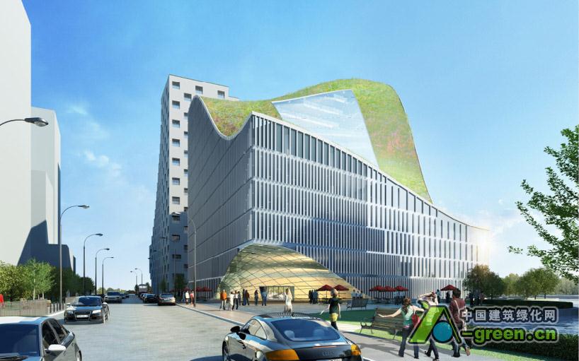 办公大楼的主立面从最高点起伏,形成了一个平滑的有中庭上的天窗的屋顶绿化。太阳光进入所有的内部空间,无论是通过外围玻璃幕墙或内部的釉面空间。