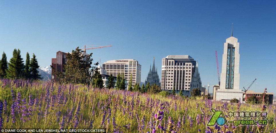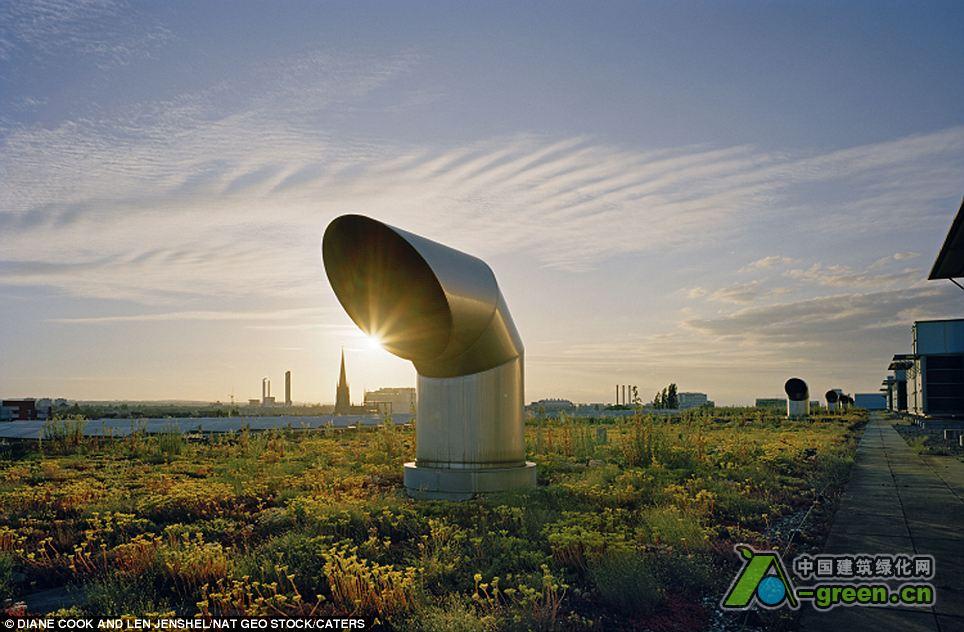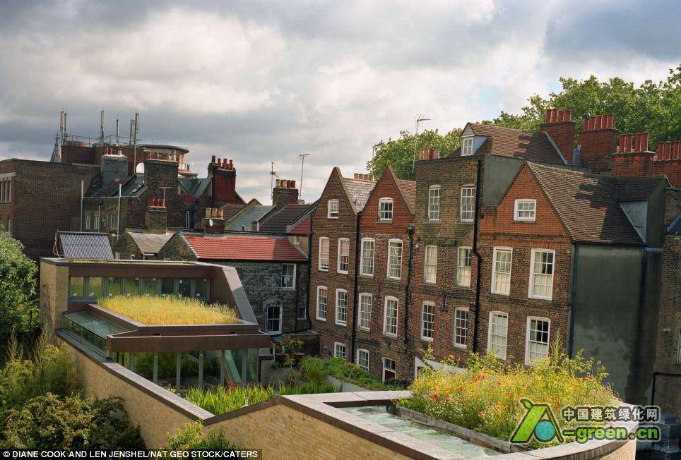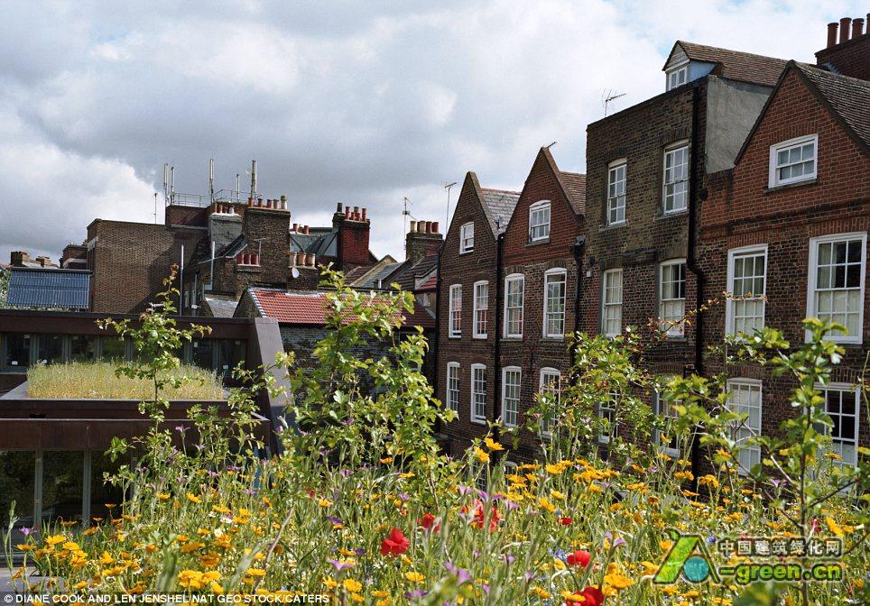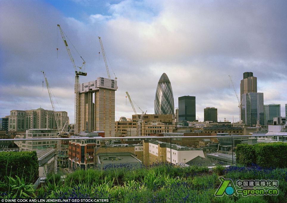 高空的风光包含从伦敦一栋房子屋顶的野花草坪到纽约一栋办公大楼屋顶的整齐的的草地。