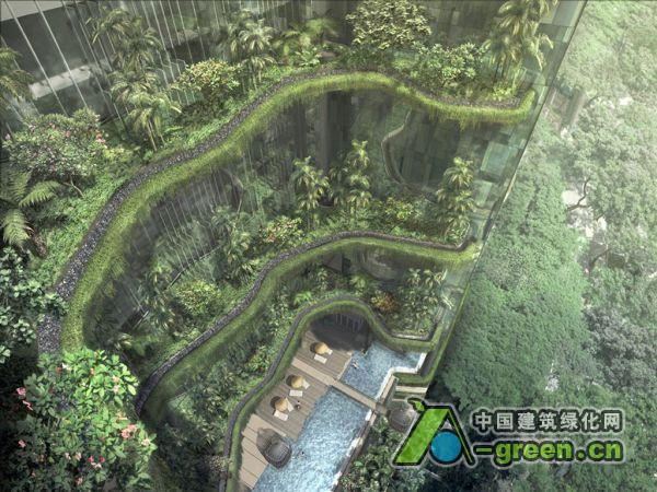 大部分为这个建筑设计的植被是设计成可利用雨水自给自足,保持新鲜。有了树,棕榈树,灌木,攀缘植物,开花植物,兰花和一大堆给你清新的空气的植物,在新加坡的假期有了一个令人耳目一新的景色和一个全新的视角,相比垂直公园酒店预定在2012年完成,这样的 “广告”对于一个现代城市的生态旅游更有广告效应。