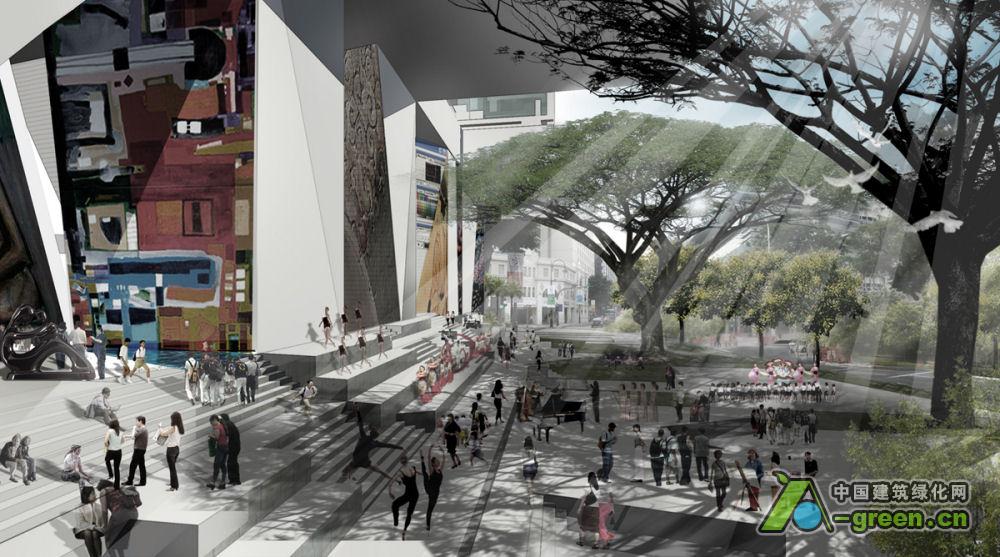 “背景”是包含一个音乐厅,戏剧剧场,黑匣子剧场和一些小型非正式的表演空间的主席台。它被预想为一个沉重的基座,一个已雕刻并凿成揭示不同比例体积的庞大的石材。这个令人振奋的多层次的空间将作为一个热带城市广场向公众开放。楼梯和平台创建了一个多样化的空间,自发的和计划中的表演可以在这里进行。