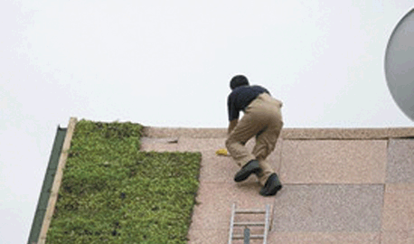 在德国城市斯图加特,政府规定许多新建筑必须进行屋顶绿化。这座巴登-符腾堡州首府城市地处盆地中央,非常不利于空气流动。夏日,炎热会笼罩这座施瓦本地区的大都市。自从政府颁布了屋顶绿化的规定后,情况大有改观。现在从空中俯瞰,斯图加特内城就像一座巨大的绿岛。(下图:在屋顶铺草的工人 来源:picture-alliance/ dpa)