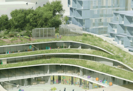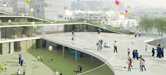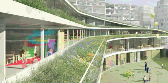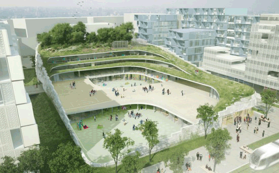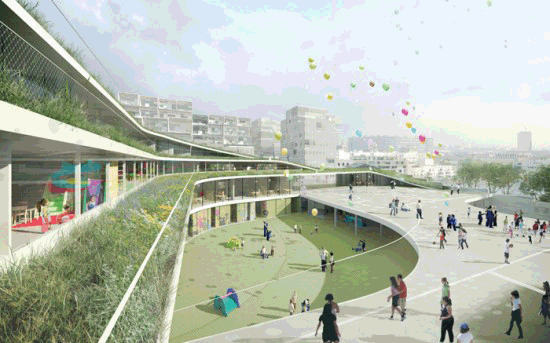 这个小学建筑设计是由Chartier-Dalix architects设计的,学校位于法国巴黎西边的布洛涅比扬古市。学校附加了公共体育场的功能,学校和体育场的盖子上分布各种植物,形成一个绿色的屋顶花园。这样的复杂的绿色屋顶花园旨在打造一个复杂的生物环境,小学生可以在这里探索和发现,以满足小孩子的好奇心理。设计师将普通的建筑连接成一个流动的曲线的形状,这种形态结合空间的起伏感很容易让人联想到“运动”。