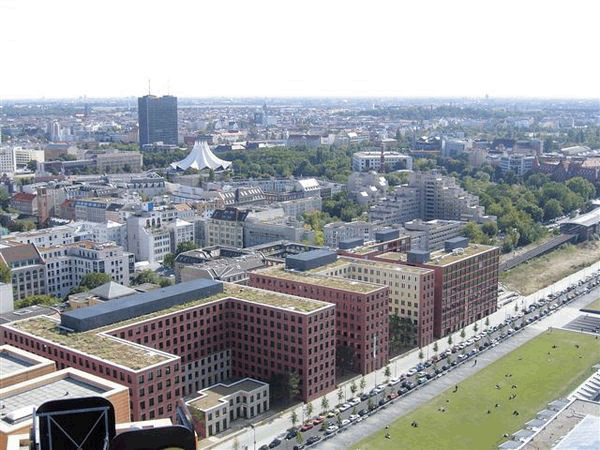 在柏林的中心从波茨坦广场,高层楼顶上看周围的建筑,在新建建筑的屋顶是除了室外设备,很明显其他地方都被绿化覆盖了。