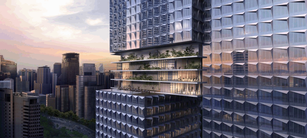 建筑的第二个平台抬升漂浮于城市上空。这些看似“空中楼阁”的楼层中设有绿色植物簇拥的餐厅、酒吧和多功能区域,给人们提供了一个绝佳的公共观景区,将最激动人心的城市风景以及临街而立的双子塔尽收眼底。三个体块分别是高端服务式公寓,豪华酒店和高端写字楼。