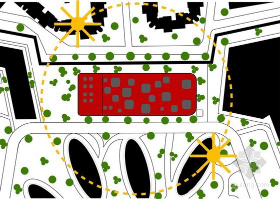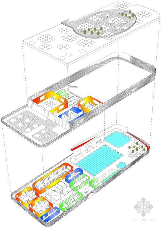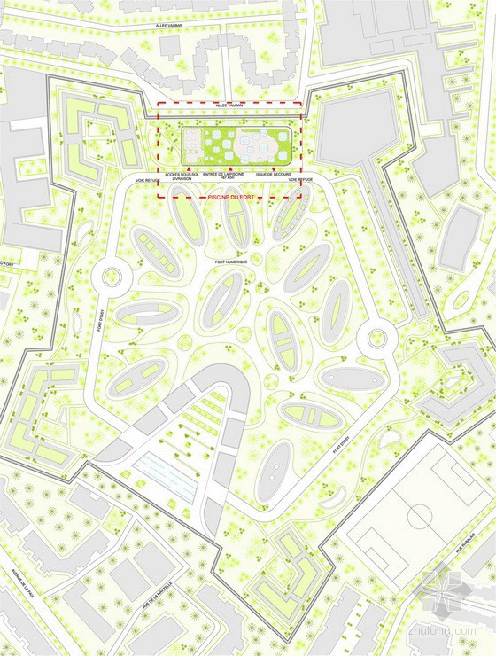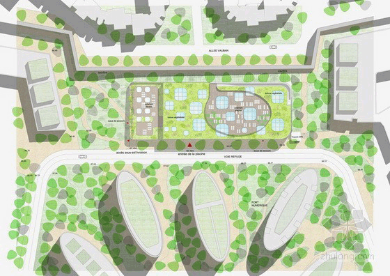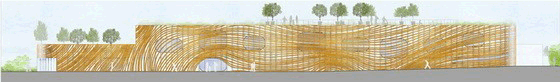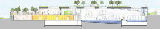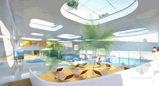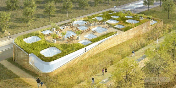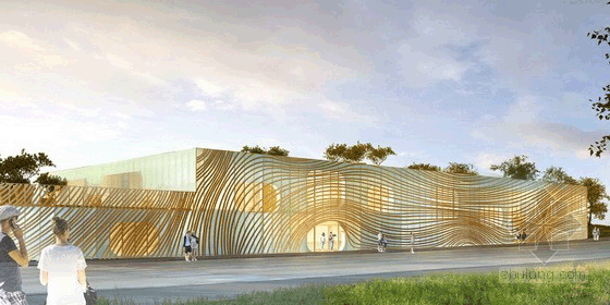 这是由mikou design studio工作室设计的位于法国巴黎的公共泳池项目。这个项目通过实践流畅性和透明性,以实现空间的自然照明。日光通过一系列圆形的天窗流入室内,营造出舒适温暖的氛围。曲线的金色的木质材料环绕外层立面,生成一种水的动感效果。线性的外侧形式因为玻璃的板面而被柔化,减少了整体的庞大感。内部空间中展示出的道路和有层次的天花板布局透露出能源的流通系统。在室内人们由周边的斜坡进行流通,可以展开活动的屋顶同时又是覆盖自然植被的日光浴室。