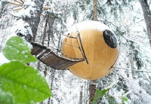 这种挂在树上的房屋体现出设计者丰富的想象力。这个成年人树屋的主要建筑材料是就地取材,用的都是当地森林里的木材。
