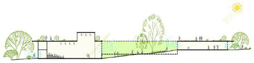 建筑屋顶为绿化和各种各样的活动场地,于是基地100%的面积都成为了室外活动场地。这个建筑像是一个万花筒,不同的人群包括营地的师生们、艺术家、观众、参观者,可以在其**同去发现和创造不同的奥秘和故事。它既是一个连续可变的事件空间,又可以灵活地适应使用上变化的需求。
