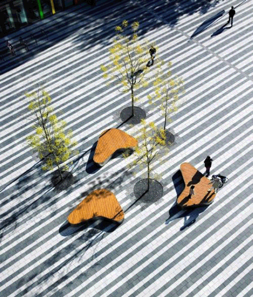 为了在所有的区域之间形成连贯的过渡,设计师打造出了白色和黑色的线条,使其围绕整个公共开放空间。这样的效果使广场像是一个精美镶嵌工艺品,在相互连接的混凝土地面融入了多功能的元素,赋予各个区域不同的特色和用途。通往新区域的入口是由宽广的广场组成,该广场的设计灵感来源于人群的移动。边缘处有着足够的空间供人们步行、席坐和举办各种活动。中间是三个非常新颖的长凳,它们围绕枝繁叶茂的树木设计而成,为人们再次驻足停留提供了绝佳的场所。