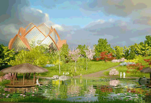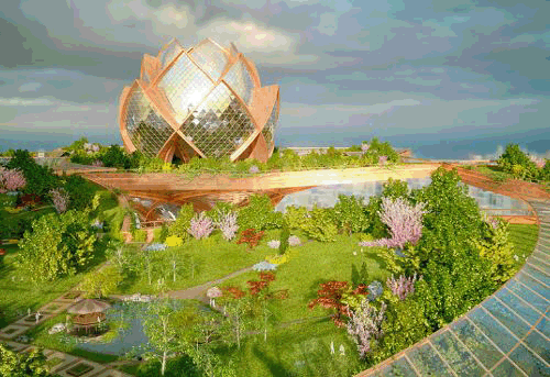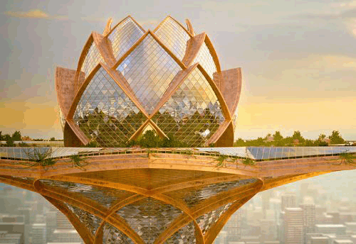 当介绍这个项目的音乐和视频展开时, 其景色是令人震撼而惊异的,试问有谁可以不被这样的美景陶醉。设计师受仿生学的启发,将这个位于大气平流层的城市花园呈现为象征着纯洁无瑕的荷花状的塔形。