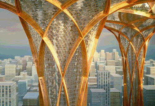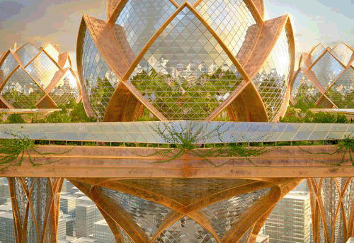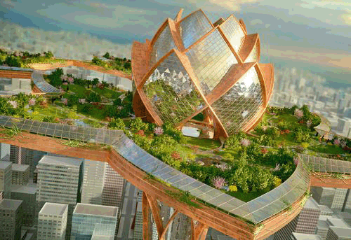设计师Hrama所设想的未来的空中之城是一个遍布着花园与绿洲,高耸入云,远离都市的拥堵与污染的世外桃源。