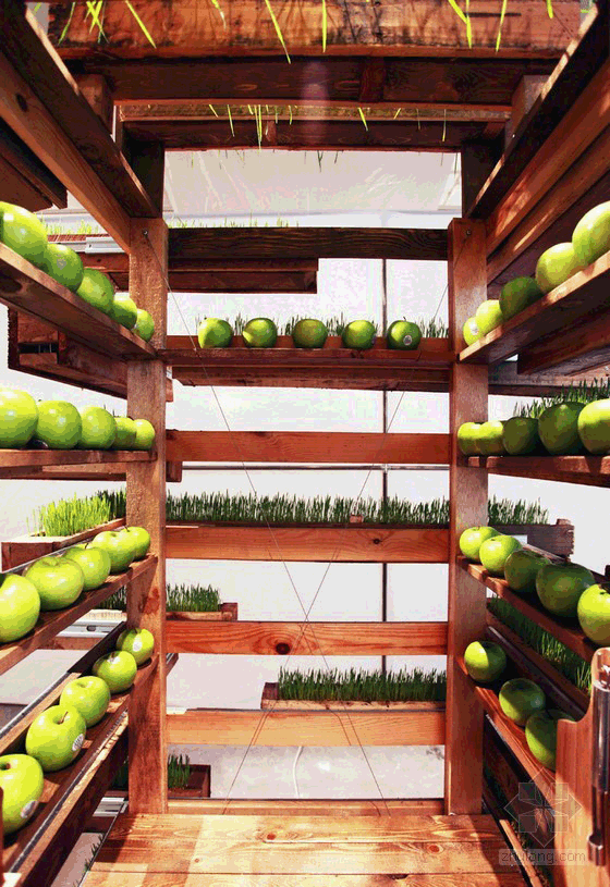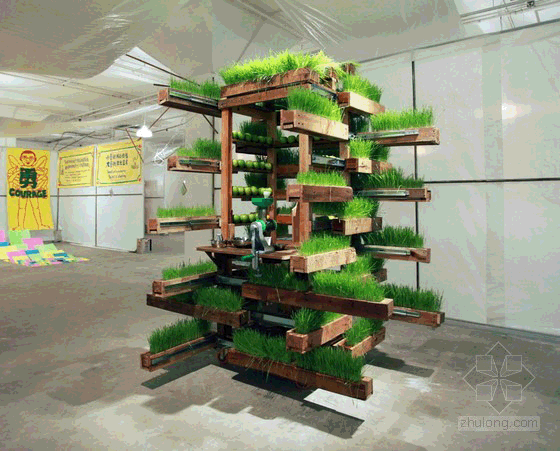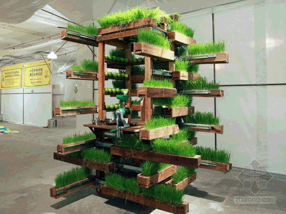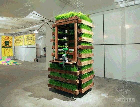 这个装置是由回收的木材制成的,设计师用一种不寻常的方式将天然木材拼接在一起,形成可种植植物的凹槽,在长方形的凹槽里种植了小麦草。这些装置通过带滚轮的推拉装置与垂直的果汁吧连接在一起,使植物能最大限度地吸收太阳光。果汁吧可以容纳一个人站在里面制作果汁。整个装置新颖,引人注目,将艺术与环保结合起来。这属于一种经过变形的零售吧,是由当地零售小商贩发明的,使用灵活,节省空间,能很好地适应当地市场条件。