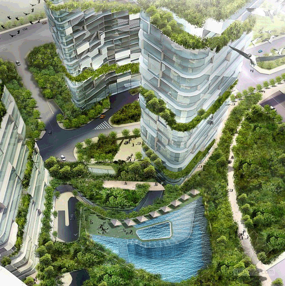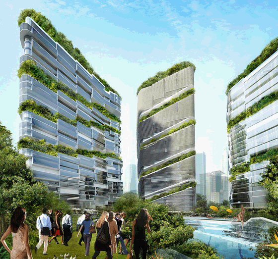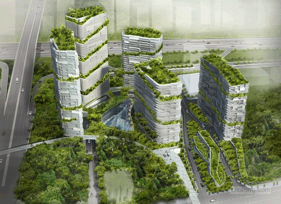 这是由TR Hamzah and Yeang事务所设计的位于重庆的北方建设工业公司总部项目,设计的主要概念反映了二十一世纪的高新科技,反映了环保生态可持续的大环境。生态设计反映了当地的特征,创造出与既有高层的对比。生态单元位于平台之内,同时建筑还包含一系列的螺旋式植被斜坡,它们连接绿色屋顶和首层空间,将阳光,植被,雨水和自然通风带入到建筑的更深处。另一个生态设计体现在绿色植被带上,这个线性的延续的景观由各种不同树木和地皮覆盖植物组成,它连接文化广场与办公塔楼。这个延续的绿色条带减少热岛效应,从而降低对于空调的依赖,降低能源消耗。