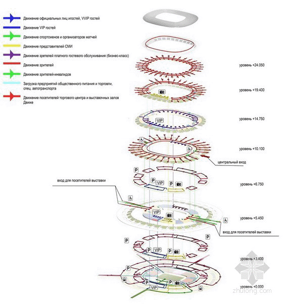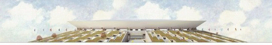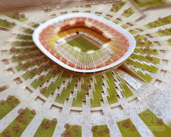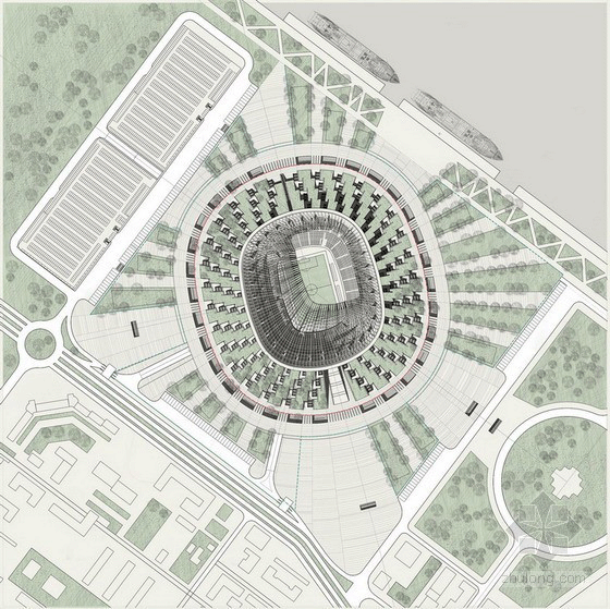 这是由Studio 44设计的位于俄罗斯的一个场馆项目,方案将场馆包含在一个绿色的山丘上,山丘中心是足球场,并含有三层的坐席,能够容纳33000名观众,场馆顶部是一个上层看台,这里能容纳另外九千人。建筑师在场馆周围排布为运动员等服务的设施,同时也包含维护性及管理性设施。另外停车场,咖啡,商店,厕所等散落在场馆外侧轮廓的不同层次上,外层的台阶覆盖表层土,从而使整个结构看上去像一座巨大的山丘。