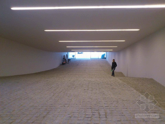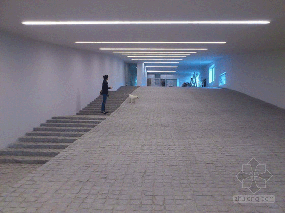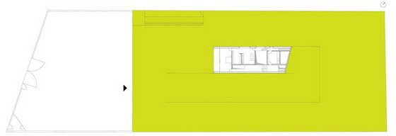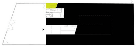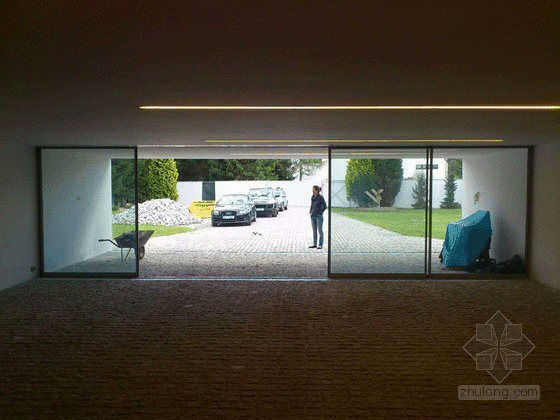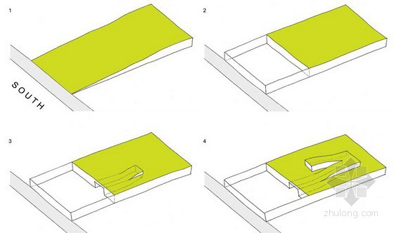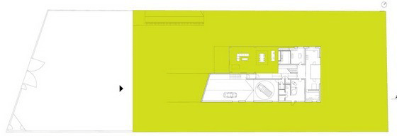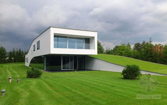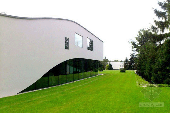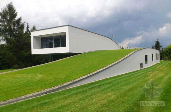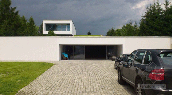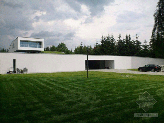 业主是一位艺术收藏家,他希望自己的住宅拥有一个流动空间,能模糊居住和艺术之间的界限。于是建筑师将业主的私人汽车直接融合到居住功能中。一个矩形的体量从地面长出,包围了基地并在绿色柱基上继续延展。在狭长的伸展体量中展示了业主的藏品,同时这个空间还作为车道使用。混凝土剪力墙和单向板支撑了绿色屋顶,这个布满植被的屋顶让建筑与周围基地无缝的连接一体。住宅首层包括车库门和车道,作为新的“主入口”而公共空间则位于抬升的草坪体量中,私人卧室位于顶层可以俯瞰基地入口。