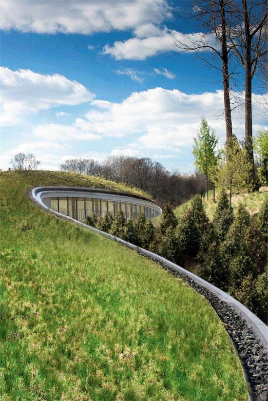 两个月前的某日清晨,伴随着纽约市长彭博手里的剪刀咔嚓一声落下,纽约建筑事务所Weiss/Manfredi设计的新布鲁克林植物园游客中心迎来了盛大的开幕仪式。这座蜿蜒起伏的玻璃大楼嵌入植物园东北角原有的小山坡内,看起来就像天衣无缝地沿着现有的地形延伸而出,通往占地52英亩(约合21万平方米)的植物园。此外,造价2800万美元的游客中心力求获得LEED金奖认证,包含了众多可持续的环境特征,最引人瞩目的就是一万平方英尺(约合929平方米)的生态屋顶。该项目获得了纽约市公共设计委员会授予的杰出设计奖。